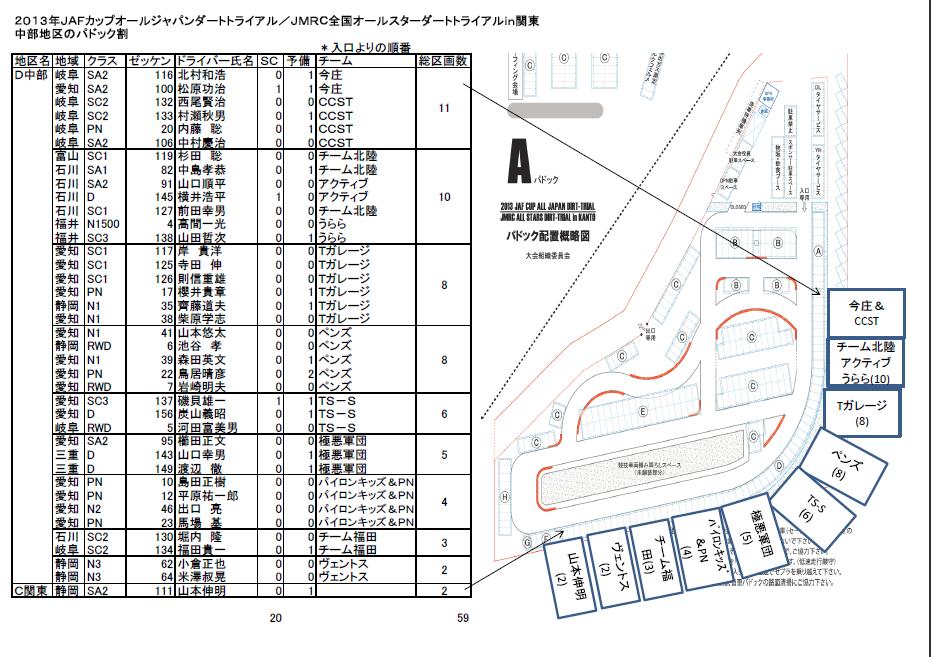 当日の混乱避けるために、部会の方でチームパドックの割り振りを決めさせていただきましたので、当日この形で配置いただけますようお願いします。